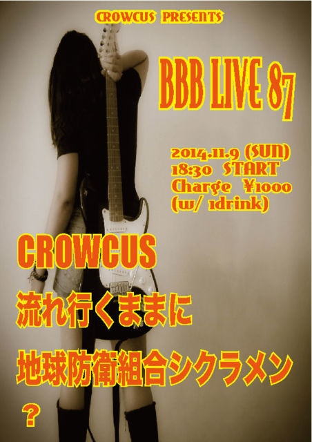 CROWCUS PRESENTS BBB LIVE 87 2014.11.9 (SUN) 18:30 START Charge \1000 (w/ 1drink) ¡ù¡¡CROWCUS ¡ù¡¡Î®¤ì¹Ô¤¯¤Þ¤Þ¤Ë ¡ù¡¡ÃϵåËɱÒÁȹ祷¥¯¥é¥á¥ó ¡ù¡¡¡©