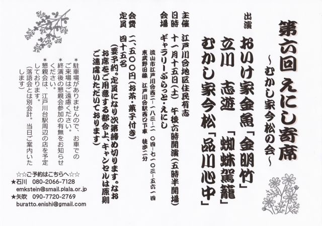 ¡ö¹ðÃΤ¬ÃÙ¤¯¤Ê¤ê¤¹¤ß¤Þ¤»¤ó¡ª ¡¡¡¡¤Þ¤À¼ã´³¤ªÀʤ¬¤¢¤ê¤Þ¤¹¤Î¤Ç¡¢¤´´õ˾¤ÎÊý¤Ï¼çºÅ¼ÔÍͤ«¡¢»ä¡¢¤¤ó¤È¤È°¸¤Ë¥á¥Ã¥»¡¼¥¸¤¯¤À¤µ¤¤¤Þ¤»¡£ Âè6²ó¡¡¤¨¤Ë¤·´óÀÊ¡Á¤à¤«¤·²Èº£¾¾¤Î²ñ¡Á ¡ÚÆü»þ¡Û¡§11·î15Æü¡ÊÅÚ¡Ë¡¡ ¸á¸å6»þ³«±é ¡Ú²ñ¾ì¡Û¡§¥®¥ã¥é¥ê¡¼¤Ö¤é¤Ã¤È¡¦¤¨¤Ë¤· ¡¡¡¡¡¡¡¡¡¡¡¡¡¡Î®»³»Ô¹¾¸ÍÀîÂæÀ¾2¡½183¡½2¡¡04-7103-5614 ¡¡¡¡¡¡¡¡¡¡¡¡¡¡ÅìÉðÌîÅÄÀþ¹¾¸ÍÀîÂæ±ØÀ¾¸ý²¼¼Ö¡¡ÅÌÊâ2ʬ¡¡ ¡¡¡¡¡¡¡¡¡¡¡¡¡¡¡¡http://buratto-enishi.on.omisenomikata.jp/ ¡Ú²ñÈñ¡Û¡§2,500±ß¡ÊÃã²Û»ÒÉÕ¤¡Ë ¡ÚÄê°÷¡Û¡§45̾¡ÊÍ×ͽÌó¡£Äê°÷¤Ë¤Ê¤ê¼¡