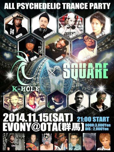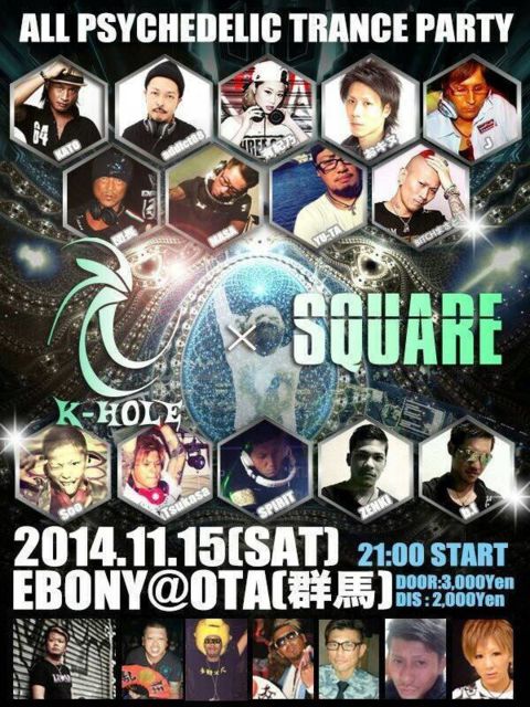 11.15(土)太田EBONY K-HOLE×SQUARE ALL PSYCHEDELIC PARTY http://ameblo.jp/trancefamily/entry-11815521666.html OPEN 22:00〜5:30 DAY\3000 GUEST\2000 団長のゲストと言って頂ければ ディスカウント料金になります FACEBOOKアルバム https://www.facebook.com/noga.danchou/media_set?set=a.565559293550368.1073741952.100002889077104&type=3 あのBIG EVENTが遂に開催! vol.1では総動員数450人over、 vol.2では350人overと 文句なしの最強イベント!! ここまでBIGメンバーが揃うのは SQUAREだけ!