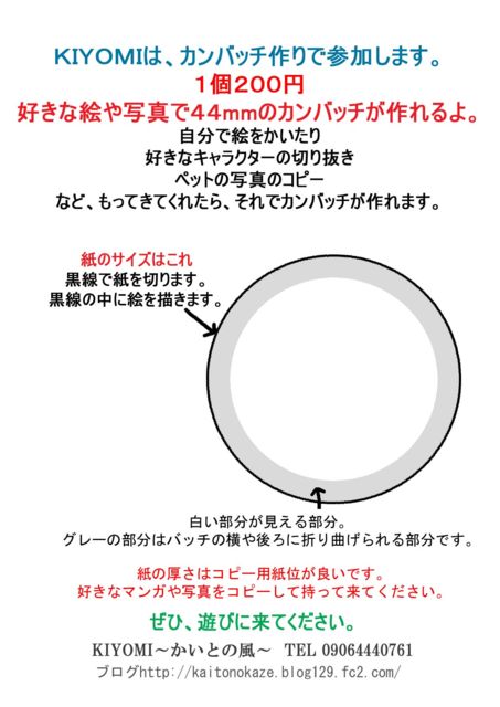 ●15日(土)・16日(日) 時間:10:00〜17:00 「みんなであそぼうキッズパーク inまこまない」 にて、カンバッチ作りコーナーを開催 場所:真駒内セキスイハイムアイスアリーナ 札幌市真駒内公園1−1 入場無料 様々な遊べるコーナーがあります。 カンバッチは、44mmのカンバッチ、1個200円で作れます。 その場でイラストを描いて作ったり 家から、好きな写真、キャラクター、イラストなどの切り抜きや、コピーを持って来て作ることもできます。 紙の厚さは、コピー用紙位の厚さがいいです。
