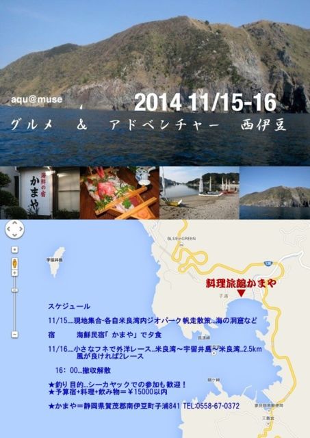 秋の海鮮料理と海から眺める西伊豆の絶景を楽しむ 米良湾の奇岩や海の洞窟探検(洞窟はカヌー仕様のみ可能) 魚釣りトローリング漁...シュノーケリング(暖かいので可能) ★シーカヤックでの参加も可能です ★16日のみの参加も可能です(参加費無料) 15日〜現地集合 自由帆走 夕食...海鮮料理と宴 16日 米良湾〜宇留井島回航〜米良湾 2.5km 外洋レース 風次第で最大2レース(希望者) 16:00 宿の温泉.....現地解散