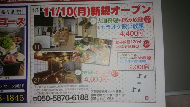 皆さん! お店を決めました! 唐戸にあります「よんのよん」ってとこにしようと思います。簡単な料理+飲み放題+カラオケがついています。詳細は以下の通り。 場所・よんのよん 住所・赤間町4-4 会費・2000円(おつまみ+飲み放題+カラオケ) スタート・22:00 終了・0:00 時間が遅いので、2次会プランにしました。下関駅から少しだけ遠いので、ご希望の方は私が駅までの間を送迎致します。また、19時くらいから、何人かで下関駅近くの「二パチ」で0次会をやるそうです。 そちらの詳細はこちら→http://mixi.jp/view_event.pl?comm_id=586