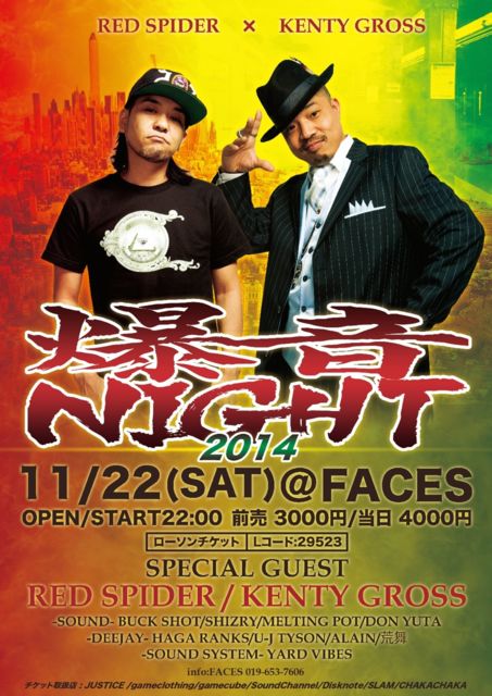 爆音NIGTH 2014 11月22日(土) 岩手県盛岡市@FACES (岩手県盛岡市大通2-4-22サンライズタウン3F) OPEN/START 22:00 RED SPIDER/KENTY GROSS出演!! (SOUND) BUCK SHOT/SHIZRY/MELTING POT/DON YUTA (DEEJAY) HAGA RANKS/U-J TYSON/ALAIN/荒舞 (SOUND SYSTEM) YARD VIBES 前売 3000円 当日 4000円 ※18歳未満入場不可 ■TICKET INFO ローソンチケット 0570-084-002(Lコード:29523) http://l-tike.com/d1/AA02G01F1.do?DBNID=1&ALCD=1&LCD=29523 チケット取扱店 ■JUSTICE Style&Fashion 盛岡市内丸6-1 (TEL019-681-613