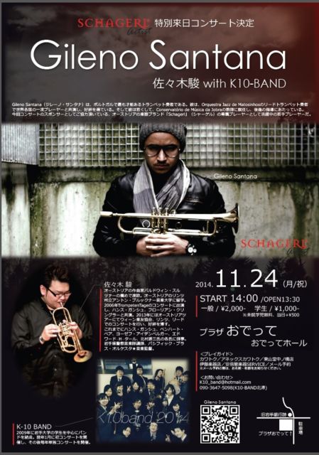 ♪゜・*:.。. .。.:*・♪ SCHAGERL 特別来日コンサート GILENO SANTANA 佐々木駿 with K-10BAND のお知らせ!! ♪゜・*:.。. .。.:*・♪ ポルトガルのトランペット奏者で、オーストリアの楽器ブランド「Schagerl(シャーゲル)」の専属プレイヤーであるGILENO SANTANA(ジレーノ・サンタナ)と、岩手県盛岡市出身のトランペット奏者である、佐々木駿(ササキシュン)がおでってホールにてジャズコンサートを開催します。 K-10BANDも出演します!! 1.催事名 Gileno Santana 特別来日コンサート with 佐々木駿&K-10BAND 2.