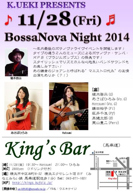 ÎФÎÍդäѤ¬²«¿§¤¯¤Ê¤Ã¤Æ¡¢ÀÖ¤¯¤Ê¤Ã¤ÆÍî¤Á¤Æ¤¤¤¯¡£¡£¡£ ½©¤«¤éÅߤؾ¯¤·¤º¤Ä°Ü¤ê¤æ¤¯·Ê¿§¤Ï¡¢¸«¤ë¤â¤Î¤ò˰¤¤µ¤»¤Þ¤»¤ó¤Í¡£ ³§Íͤª¸µµ¤¤Ç¤¹¤«¡© 11·î28Æü¡Ê¶â¡Ë¤Ï²£ÉÍ ÇÏ¼ÖÆ»King's Bar (¥¥ó¥°¥¹¥Ð¡¼¡¢045-671-1601) Bossa Nova Night 2014¤ËÂХХó¤Ç½Ð±éÃפ·¤Þ¤¹¡£ ¤ªÅ¹¤ÎHPhttp://kings.bufsiz.jp/ 19:30¡ÁHatsumi¡¡(Vo.Gt) 20:30¡Á¤¢¤µ¤Ð¤Ò¤í¤ß¡ÊVo.Gt¡Ë ¿¢ÌÚ·¼¼¨(G) ºä°æÀéϲ(Pf) ³ùÅÄ͵»Ò(Fl) ¹âÁÒÂÀϺ (B)·ª»³ËÆó(Perc) ¥Á¥ã¡¼¥¸ ¡ï2,800(1¥É¥ê¥ó¥¯ÉÕ¤) ¸ÄÀ¤Î°ã¤¦Æó¿Í¤Î¥ß¥å¡¼¥º¤Ë¤è¤ë¥Ü¥µ¥Î¥ô¥¡¡¦¥µ¥ó¥Ð¡¦MPB(¥Ö¥é¥¸¥ë