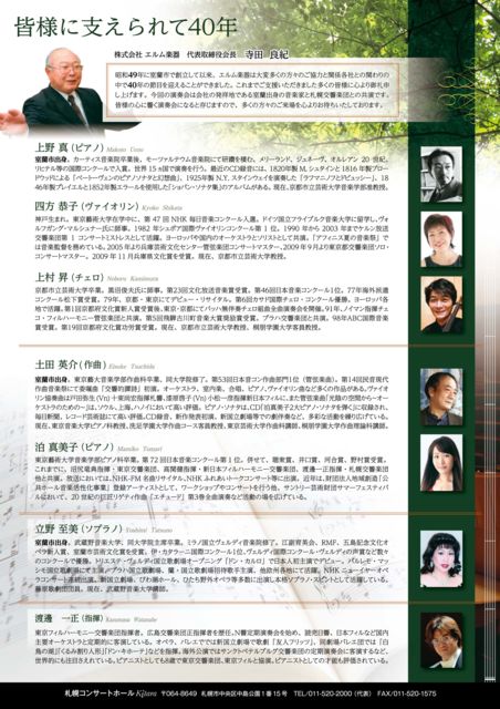 出演 土田 英介 〈作曲家〉 室蘭市出身 上野 真 〈ピアノ〉 室蘭市出身 立野 至美 〈ソプラノ〉 室蘭市出身 泊 真美子〈ピアノ〉 四方 恭子〈ヴァイオリン〉 上村 昇 〈チェロ〉 管弦楽:渡邊 一正指揮 札幌交響楽団 〜プログラム〜 ・リスト作曲:ピアノ協奏曲 第1番 変ホ長調 ピアノ:上野 真 ・ピアノ、ヴァイオリン、チェロと管弦楽のための協奏曲 ハ長調 OP.56/ベートーヴェン ピアノ:上野 真・ヴァイオリン:四方 恭子・チェロ:上村 昇 ・土田 英介作曲:ピアノ協奏曲【世界初演】 ピアノ:泊 真
