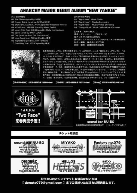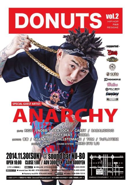 11月30日 (sun) @SOUND BAR NU-BO −DONUTS vol.2− 今回のSPECIAL GUESTは エイベックスからメジャーデビューした 京都のGHETTO SUPER STAR 【 ANARCHY 】です!! OPEN 18:00〜CLOSE 1:00 前売り \3000 当日 \4000 [ DJ ] RIGO NOBB JAH SOCK CAREY BABALICIOUS [ SOUND ] JAZZY BEAT COBLA [ RAPPER ] 音音 CHILL STOMACH [ DEEJAY ] SKAN KID TOM 7sPLAYERZ [ PHOTO ] GIGIO