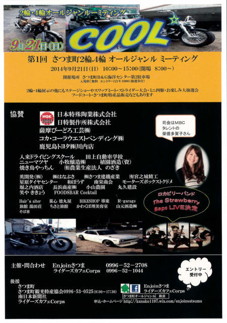こちらのコミュにも関わりの深い『ライダーズカフェCorps』さんプロデュースのイベントが開催されます。 イベントの詳細はこちら↓ (ホームページ) http://kanako1107.wix.com/enjoinsatsuma#!1/cn7q (facebook) https://www.facebook.com/events/613770238733952/ Corpsコミュはこちら↓ http://mixi.jp/view_community.pl?id=6028555 チラシ・開催要領はこちら ※合言葉『COOL』で開きます↓ http://photo.mixi.jp/view_album.pl?album_id=500000092114585&owner_id=41206668 ちなみにわたくし、うっかりエントリーし