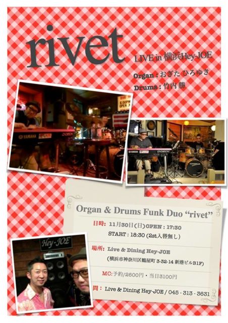 Organ & Drums Funk Duo ¡Èrivet¡É Æü»þ: 11·î30Æü(Æü)OPEN : 17:30 START : 18:30 (2stÆþÂØÌµ¤·) ¾ì½ê: Live & Dining Hey-JOE (²£ÉͻԿÀÆàÀî¶èÄá²°Ä® 3-32-14 ¿·¹Á¥Ò゙¥ëB1F) ¡¡¡¡¡¡http://www.ne.jp/asahi/hey-joe/yokohama/index.html MC:ͽÌó/2600±ß¡¦ÅöÆü3100±ß Ìä: Live & Dining Hey-JOE / 045 - 313 - 3631