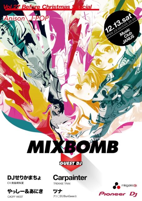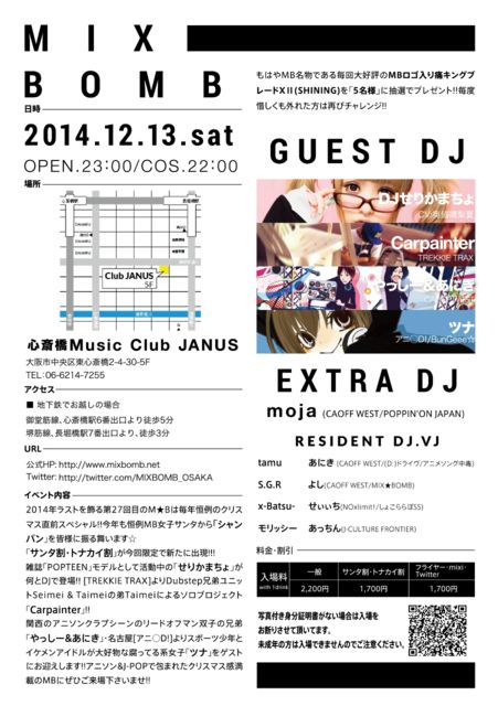 管理人様、貴重なスペースお借り致します。 不適切な場合は削除して下さいませ。 【MIX★BOMB Vol.27〜Before Christmas Special〜】 2014年ラストを飾る第27回目のM★Bは毎年恒例のクリスマス直前スペシャル 今年も恒例MB女子サンタから「シャンパン」を皆様に振る舞います☆ 「サンタ割・トナカイ割」が今回限定で新たに出現! 雑誌「POPTEEN」モデルとして活動中の「せりかまちょ」が何とDJで登場!! [TREKKIE TRAX]よりDubstep兄弟ユニットSeimei & Taimeiの弟Taimeiによるソロプロジェクト「Carp