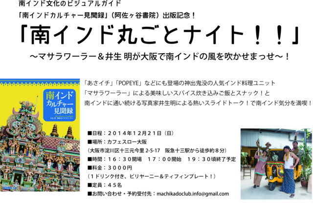 南インドの濃厚な文化をビジュアルで紹介する「南インドカルチャー見聞録」の出版を記念して、著者のインド料理ユニット「マサラワーラー」と写真家井生明が関西ツアーを開催! 大阪ではビリヤーニーとスナックのプレートが食べられますよ! そして井生明による熱い南インドスライドトーク!! 大阪の南インド好きは是非とも来てねー! 【大阪編 12月21日(日)】 「南インド丸ごとナイト!!」〜マサラワーラー&井生 明が大阪で南インドの風を吹かせまっせ〜! マサラワーラーによる美味しいスパイス炊き込みご飯とスナック!