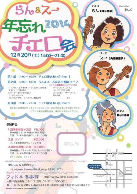 皆さま、お待たせしました! 昨年以来、恒例の「らん&スーの年忘れチェロ会 2014」が、 12月20日(土)の午後から、大阪・四ツ橋にある「フィドル倶楽部」にて開催されます。 評判急上昇の「らん&スーデュオ」のライブが聴ける、またとないチャンスです! 【らん&スー チェロデュオについて】 http://ranandsue.blogspot.jp/ 当日は午後2時〜9時まで、以下の3部構成にて行われます。 (詳細は上記チラシのとおり) 【日時】 2014年12月20日(土曜日) 14:00〜21:00 【会場】 フ