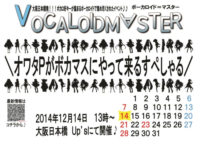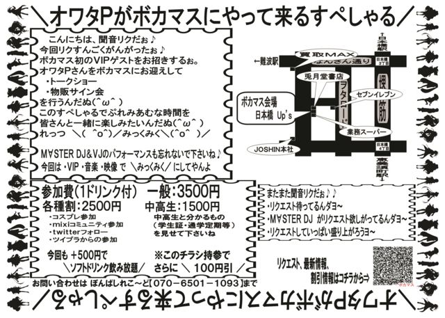 聞音リク 「参加表明+リクエストでボカマスをどしどし盛り上げていって欲しいんダヨ〜」 と、言う事で 12/14 \オワタP/がやってくるすぺしゃるの 参加表明、リクエストをこのトピで受付しま〜す♪♪ 祝!! \ 3 年 目 突 入 / いよいよやってきますよ 12/14の第2日曜日、大阪日本橋がざわめく!!! ボカロ界で知らない人はいない重鎮 オワタP が来ます!!!! 大阪日本橋発 を合言葉に寄り道しながらも3年目に突入!! 皆様の支えあってのボカマスです。 聞音リク 「3年目はズバリ