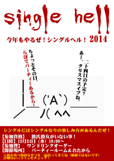 ¥¯¥ê¥¹¥Þ¥¹¤¬º£Ç¯¤â¤ä¤Ã¤Æ¤¯¤ë¡¦¡¦¡¦ ³¹¤Ï¥«¥Ã¥×¥ë¤Ç°î¤ì¡¦¡¦¡¦»ê¤ë¤È¤³¤í¤Ç¼ª¤Ë¤¹¤ë¥¯¥ê¥¹¥Þ¥¹¥½¥ó¥°¡¦¡¦¡¦ ¥ê¥¢½¼Çúȯ¤·¤í¡ª¤È¡¢¶«¤Ó¤¿¤¤µ¤»ý¤Á¤ò¤ª»ý¤Á¤Î¤½¤³¤Î¥·¥ó¥°¥ë¤Ê¤¢¤Ê¤¿¡ª ¿´ÇÛ¤¹¤ë¤³¤È¤Ê¤«¤ì¡ª¥·¥ó¥°¥ë¤ÊÅÛ¤é¤Ë¤Ï¥·¥ó¥°¥ë¤Ê¤ê¤Î³Ú¤·¤ßÊý¤¬¤¢¤ë¡ª ¤È¡¢¤¤¤¦»ö¤Ç¡¢ËèǯÂçÀ¹¤ê¾å¤¬¤ê¤ÇÂ繥ɾ¤Î¡Ö¥·¥ó¥°¥ë¥Ø¥ë¡×¤òº£Ç¯¤â³«ºÅ¤·¤Þ¤¹¡ª ¤¢¤Î¥«¥ª¥¹¤Ê¶õ´Ö¤¬ºÆ¤Ó¡ª »²²Ã»ñ³Ê¤Ï¤¿¤À°ì¤Ä¡ª ¡ÖÈà»á¡¢Èà½÷¤¬¤¤¤Ê¤¤»ö¡×¤À¤±¤Ç¤¹¡ª ¾ÜºÙ¤Ï°Ê²¼¡ª ¡ÚÆü»þ¡Û¡¡£±£²·î£²£´Æü¡Ê¿å¡Ë¡¡£±£¹¡§£°£°¡Á¡Ê½ªÎ»»þ´Ö̤Äê¡Ë ¡Ú¾ì½ê¡Û¡¡¤ª