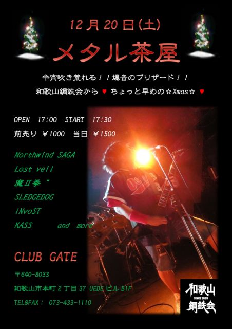 和歌山鋼鉄会がお送りする 2014年を締めくくる熱いイベントはこれだ! メタル茶屋 〜今宵吹き荒れる!爆音のブリザード!! 和歌山鋼鉄会からちょっと早めの☆X'mas☆〜 出演 INvoST KASS Lost veil 魔II拳” Northwind SAGA(大阪) SLEDGEDOG andMORE 前売 ¥1,000 当日 ¥1,500 和歌山市 club GATE http://www.club-gate.com ※詳細は随時更新