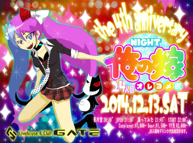 2014,12.13 SAT更衣室20:30~ OPEN 21:30~ 踊ってみた 21:45~ START 22:00~ Cosplayer:\1,000- Door:\1,500- リア充\2,000- ※入場時ドリンク代別途頂きます。 嫁★E-ROGic a.k.a. kyon ★あにぃ 俺嫁メイツ★ お嬢、SO-MA、電波、まえがみ、G!カサカサ、ぼっち、タスクスタン、流兎 VJ★ ふよー、タスクスタン、marie、ein スタッフ★ 職人、かいけー、KY、ばねこ 撮影スタッフ★ 流兎、がっちー、しののめ 踊ってみた★ 梓 24人目踊ってみたは 【メグメグ☆ファイアーエンドレスナイト】 和歌山発アニソ