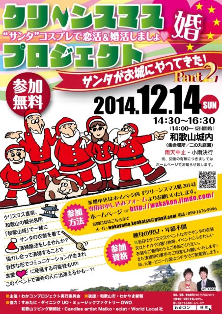 今年の冬もあのイベントがやってくる!! 2013年冬に開催され、全国の各メディアに取り上げられ、NHKでは特集を組まれる程の一大企画となったあのイベントが再び・・・ 2014年12月14日(日)再びサンタがお城にやって来る!! クリーンスマス婚2014〜サンタがお城にやってきた〜の開催が決定致しました!! 今回は前回よりさらにパワーアップ!!参加者の方には和歌山城の良さも知ってもらいながら、掃除という共同作業を通して出会いを楽しんでもらいたい!そんな思いからより楽しい一日にしてもらえる様、ゲーム感覚で楽しめるイベントを