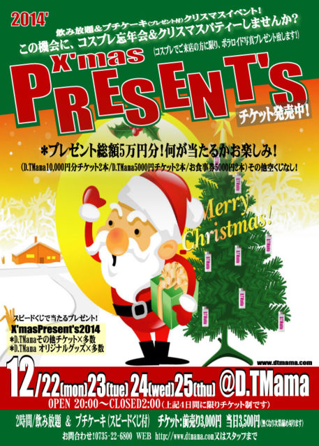 D.TMama X'masPresent's 2014 飲み放題プチケーキ付(クリスマスプレゼント付)イベント! 注意:音楽イベントではございません。 (この機会にグループでクリスマスパーティー、コスプレ忘年会 など、様々な用途にいかがですか?) 2014年12月22日(月)〜25日(木)までの間4日間 今年もやります!クリスマス特別企画、2時間呑み放題でプチケーキ付が なんと...... お一人様3000円(前売り)さらに来店と同時にくじ引きで! D.TMamaドリンク券(1万円分)2名様、D.TMamaドリンク券(5千円分)2名様、焼肉大門お食事券(5千円分)2名様など