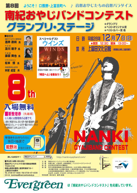 いつも ひろぼうしを応援していただきありがとうございます(*^。^*) 先日メンバーから報告があったと思いますが ひろぼうしが「南紀おやじバンドコンテスト」に応募して書類・音源審査でファイナルに残り 「グランプリステージ」に出演できることになりましたヾ(@⌒▽⌒@)ノ 遠方になりますが応援に来ていただけたらうれしいです♪ 入場は無料ですが整理券が必要です! 来ていただけることがはっきりしている方は早めにひろぼうしメンバーにご連絡いただくか 本部に直接申し込んでください 『南紀おやじバンドコンテスト』グランプ