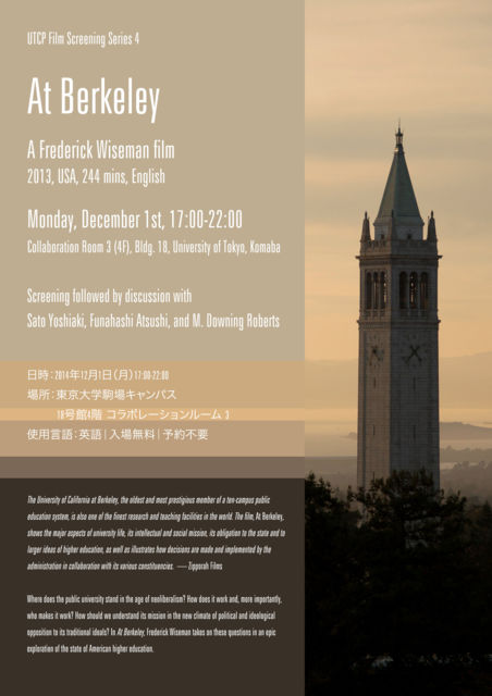 ワイズマン・ファンのみなさん、 本邦未公開作品「At Berkeley」が、東大で1回だけ上映されます! お見逃しなく! 私、舩橋淳もトークで参加します! 詳細: http://utcp.c.u-tokyo.ac.jp/events/2014/12/film_screening_at_berkeley/