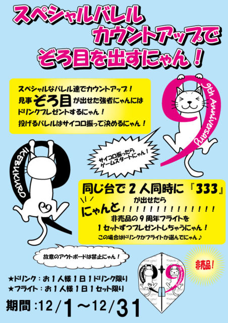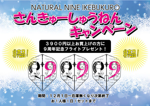 投げ場でのイベントも開催!!! ★ナチュラルナイン池袋店でおなじみのスペシャルなバレルを使ってカウントアップ! 見事ぞろ目が出せたらドリンクプレゼント!! さらに!!!今回は先程UPした非売品フライトが投げ場でもGETできちゃうチャンスが!!! ★2人で同じ台で仲良く『333点』が出せたら、9周年記念フライトを1セットずつプレゼントしちゃいます!!! これは相方見つけてどんどんチャレンジするしかないですね♪ 12月は本当にイベントが目白押し!!! ぜひぜひイベントもりだくさんのナチュラルナインへ遊びに来て下さいね