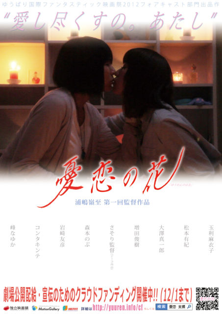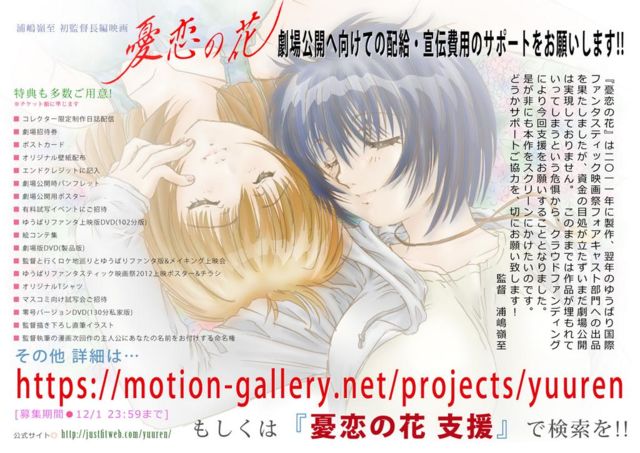 浦嶋です。 3年前にこの『憂恋の花』という長編実写映画を制作致しましたが、劇場公開はいまだ実現しておらず、このたびクラウドファンディングによる劇場公開資金を募るプロジェクトを開始致しました。 詳細は以下のサイトをご参照ください。 https://motion-gallery.net/projects/yuuren 2011年に制作した本作は、翌2012年にゆうばり国際ファンタスティック映画祭への出品上映(フォアキャスト部門)を果たしましたが、企画当初からの目標であった劇場での公開は、制作から3年を経た現在もいまだに実現できていません。 次のステップで資金