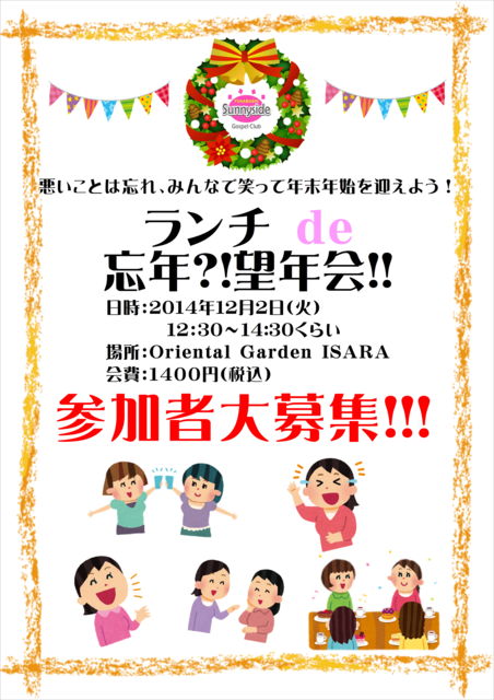 日時:12月2日(火)練習会後 12:30〜14:30くらい 場所:Oriental Garden ISARA http://www.kaivi-dining.com/isara/ 会費:1,400円(税込) *プリフィクスのメイン料理1品+前菜・サラダ・デザートビュッフェ+1ドリンク *料理はアジアン料理です。 *会費は当日集めます。 事前に料理&ドリンクをお店に注文しますので、 参加希望表明される方は、パート・ニックネーム、そして下記リンクを見て、料理とドリンクも合わせてお知らせください。 http://www.kaivi-dining.com/isara/images/menu_buffet.jpg