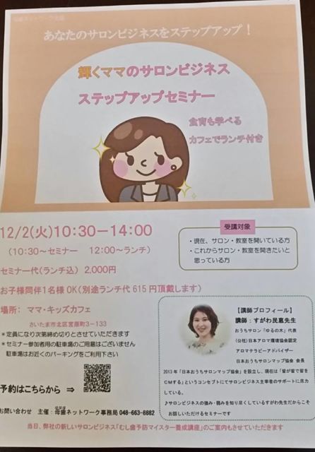 キャンセル出ました。 現在残席2名(子ども同室1名までOK) お申込み受付中です♪ ・子育てしながらの自分流のお仕事とは? ・幼稚園に子どもが入園したら何か始めてみたい ・子育てと仕事をうまく両立するには? ・ 今の仕事をステップアップしたい! など お話の中でママが働くヒントが見つかるハズ☆ おうちサロン『ゆるの木』を主宰するすがわさんをお招きしてのセミナーです。 「日本おうちサロンマップ教会」 を設立し、広くサロンビジネス主催者のサポートをしている方です。 お話の後は併設の食育カフェでランチ付き☆