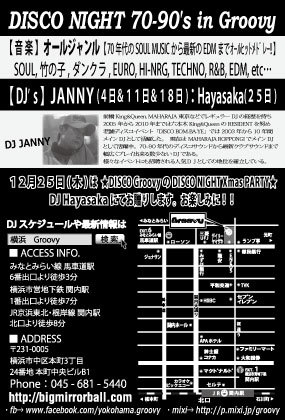 【毎週木曜日は!おなじみGroovyのディスコナイト】 70年代のSOULミュージックから最新のEDMまでオールヒットメドレー!踊れる曲盛り沢山でお贈りします♬ 【オーガナイザー】 JUN http://page.mixi.jp/view_page.pl?page_id=105505 https://www.facebook.com/DISCONIGHTGroovy 【DJ】 JANNY(MAHARAJA ROPPONGI) 【音楽】ALL GENRE (SOUL、竹の子、ダンクラ、EURO、HI-NRG、TECHNO、R&B、EDM、etc…) 【開催時間】 19:00〜24:00 【料金】 男性:¥2,500/2Drinks+ビュッフェ付 女性:¥2,000/2Drinks+ビュ