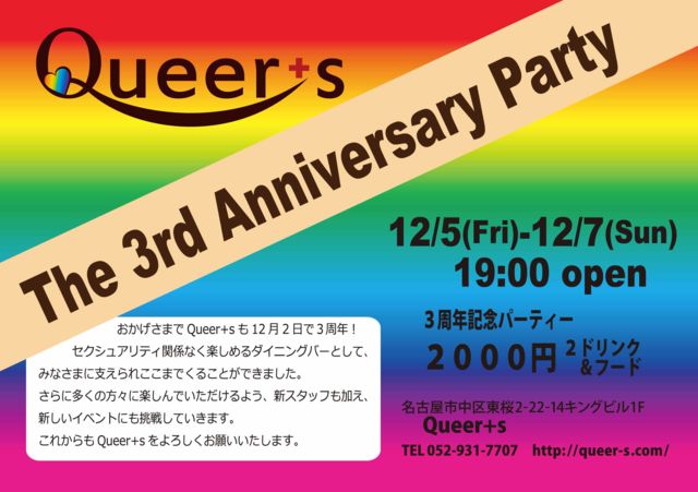 Queer+s3¼þǯ¡¢ÆÃÊ̱ĶȻ°Æü´Ö Mix BAR ¡ÖQueers¡×¤Ï¡¢12·î¤Ç3¼þǯ¤ò·Þ¤¨¤Þ¤¹¡£ ¤½¤³¤Ç¡¢£±£²·î¤ÎÂ裱½µ¡ª¡ª £±£²·î£µÆü¡Ê¶â¡Ë £±£²·î£¶Æü¡ÊÅÚ¡Ë £±£²·î£·Æü¡ÊÆü¡Ë £³Æü´Ö¡ª £³¼þǯµÇ°µÇ°±Ä¶È¹Ô¤¤¤Þ¤¹¡ª ³Æ±Ä¶ÈÆü¤Ï £±£²·î£µÆü¡Ê¶â¡Ë °Â´Ö¤æ¤&¤¢¤º¤µ¤Î£³¼þǯ±Ä¶È OPEN¡¡19:00~ MidNight ¥·¥¹¥Æ¥à¡¡2000±ß¡Ê2¥É¥ê¥ó¥¯+1¥×¥ì¡¼¥È¡Ë *¤³¤ÎÆü¡¢¶â»³Æî¸ý¤Î¡Ö¤Á¤ã¤ÖÂæ¡×¤Ï¤ªµÙ¤ß¤Ç¤¹¡£ £±£²·î£¶Æü¡ÊÅÚ¡Ë ½÷Áõ»Ò¥·¥ã¥ë¥à ¡õ ¥¢¥À¥ë¥Ç¥£¡¼¡ÖÈþËâ½÷¡×¤Ê¥¥ã¥¹¥Èã¤Î £³£ò£ä ¥¢¥Ë¥Ð¡¼¥µ¥ê¡¼ with¡¡Saturday¢ö OPEN¡¡19:00~ MidNi