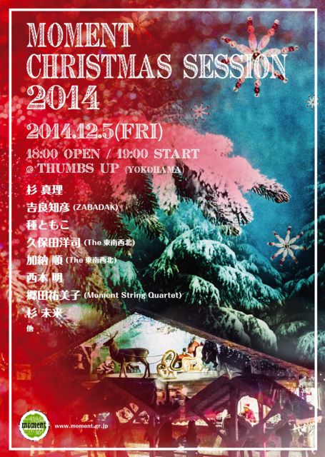 <Moment Christmas Session 2014> 12月5日(金)、横浜サムズアップに素敵なアーティストが集い、一足早いクリスマスを彩ります。杉 真理、ZABADAKの吉良知彦、種ともこ、The東南西北から久保田洋司と加納 順、他の競演によるクリスマスセッションライブです。そして、西本 明(key)、Moment String Quartetの郷田祐美子(チェロ)、杉 未来(Dr)も参加! どうぞお楽しみに! 出演:杉 真理/吉良知彦(ZABADAK)/種ともこ/久保田洋司(The東南西北)/加納 順(The東南西北)/西本 明(key)/郷田祐美子(Moment String Quartet)/杉 未来(Dr)/他 日