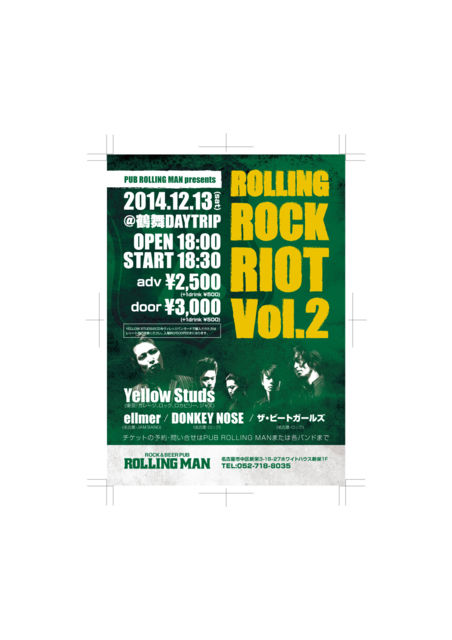 ROCK & BEER PUB ROLLING MAN¼çºÅ¡ª¡ª OPEN 18:00¡¡START 18:30 ADV 2500±ß¡¡DOOR 3000±ß ¢£½Ð±é¥Ð¥ó¥É ¡¡Yellow Studs ¡ÊÅìµþ¡Ë ¡¡ellmer¡Ê̾¸Å²°¡Ë ¡¡DONKEY NODE¡Ê̾¸Å²°¡Ë ¡¡¥¶¡¦¥Ó¡¼¥È¥¬¡¼¥ë¥º¡Ê̾¸Å²°¡Ë ¡ù20:30º¢¡Á½Ð±é ¢£²ñ¾ì¡§Ì¾¸Å²°ÄáÉñDAYTRIP ¢¨¥Á¥±¥Ã¥È¤ÎÁ°Çä¤êͽÌó¤ÏROLLING MAN¡¡µÚ¤Ó¡¡³Æ¥Ð¥ó¥É¤Ç¼è°·¤¤Ãæ ROLLINGMAN¤Î¥á¡¼¥ë¥¢¥É¥ì¥¹ ¡¡¡¡rollingman41@gmail.com ¢¨¤ªÌ¾Á°¡¢Ëç¿ô¡¢¤´Ï¢ÍíÀè¤ò¤ªÃΤ餻¤¯¤À¤µ¤¤ ¢¨¥Á¥±¥Ã¥È¤ÏÄê°÷¤Ë㤷¼¡Â轪λ¤·¤Þ¤¹¡£
