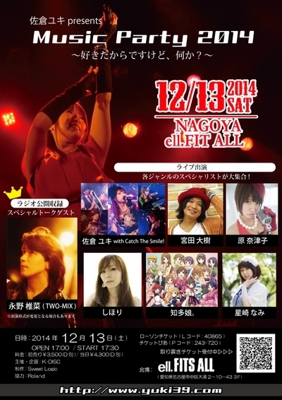 º´Á񴾴 presents ¡ØMusic Party 2014¡Ù ¡Á¹¥¤¤À¤«¤é¤Ç¤¹¤±¤É¡¢²¿¤«?¡Á ¡ÁMusic Party(¤ß¤å¡Á¤Ñ)¤¬µ¢¤Ã¤Æ¤¤¿!! ¡¡º´Áҥ楼çºÅ 2014ǯÁí¤Þ¤È¤áÂç´¶¼Õº×¥¤¥Ù¥ó¥È³«ºÅ!! ¡¡³Æ¥¸¥ã¥ó¥ë¤Ç³èÌö¤¹¤ë¥¢¡¼¥Æ¥£¥¹¥Èã¤ò´¬¤¹þ¤ó¤Ç¤Î¡¢ ¡¡¡Ö¹¥¤¡×¤¬µÍ¤Þ¤Ã¤¿¥¨¥ó¥¿¡¼¥Æ¥¤¥á¥ó¥È¥¤¥Ù¥ó¥È ¡Á ¡üÆü»þ¡§ 2014ǯ12·î13Æü(ÅÚ) OPEN 17:00¡¿START 17:30 ¡ü²ñ¾ì¡§ ̾¸Å²°¡¿ell.FITS ALL ¡¡¡¡¡¡¡¡(°¦Ãθ©Ì¾¸Å²°»ÔÃæ¶èÂç¿Ü2-10-43 3F) ¡¡¡¡¡¡¡¡[ºÇ´ó¤ê±Ø] ̾¸Å²°»Ô±ÄÄáÉñÀþ Âç¿Ü´Ñ²» 2Èֽиý ÅÌÊâ1ʬ ¡üÎÁ¶â¡§ Á°Çä¤ê¡ï3,500(DÊÌ)¡¿ÅöÆü¡ï4,300(DÊÌ)