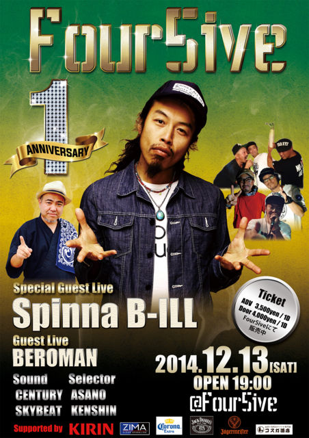 Four5ive1周年パーティー! スペシャルゲストにSpinna B-ILLを迎え開催! 地元岩手のレゲエシーンを盛り上げているCENTURY、SKY BEAT、KENSHIN、気仙沼からASANO、さらに石巻からBERO MAN!熱いレゲエを体感して下さい! TICKET ADV 3,500yen / 1Drink DOOR 4,000yen / 1Drink 前売券 チケットぴあ http://ticket.pia.jp/pia/event.do?eventCd=1448719 Pコード247-947