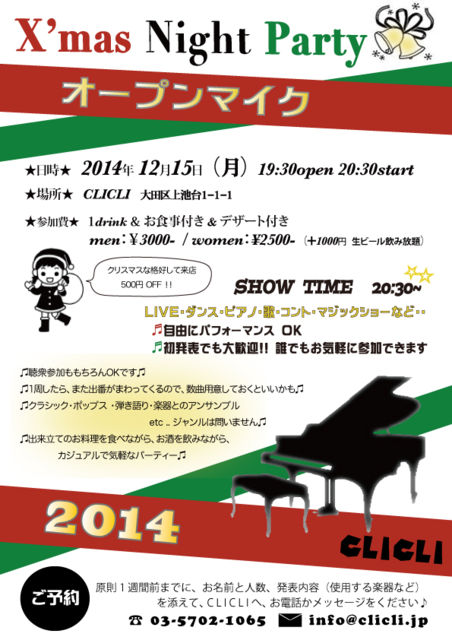 ★ CLICLI 2014 X'mas Night Party ★ オープンマイク × クリスマス 12月15日(月)@ 旗の台 CLICLI 毎週月曜日、オープンマイクを開催しています 12月の3週目は、クリスマスということで、 ハロウィンにつづき、クリスマスパーティーを開催 クリスマスな格好して参加も大歓迎 ピアノ弾いたり・ギター弾いたり・歌ったり・踊ったり・・ 自由なオープンステージご用意♪ みんなで美味しいお料理を食べてお酒も飲みながら、 楽しく過ごしましょう!!! という