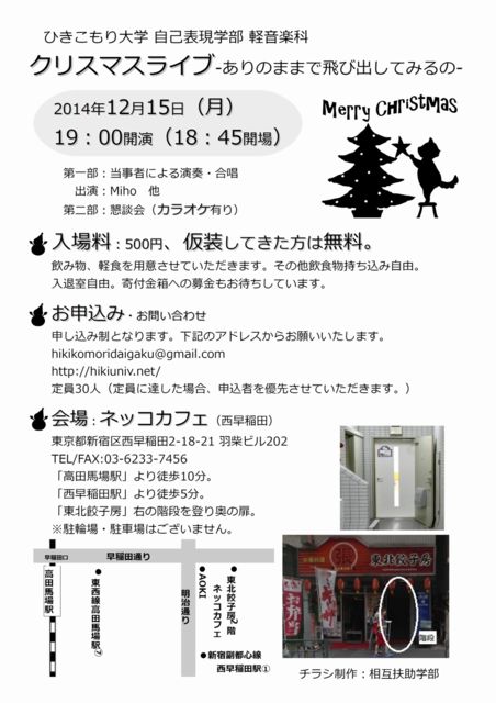 【日時】2014年12月15日(月)18時45分開場 19時00分開演 【場所】ネッコカフェ(西早稲田) 東京都新宿区西早稲田2-18-21 羽柴ビル202 TEL/FAX:03-6233-7456 「高田馬場駅」より徒歩10分。 「西早稲田駅」より徒歩5分。 「東北餃子房」右の階段を登り奥の扉。 ※駐輪場・駐車場はございません。 【定員】30人(定員に達した場合、申込者を優先させていただきます。) 【内容】第一部:当事者による演奏・合唱 出演:Miho TM NeccoWork 他 第二部:懇談会(カラオケ有り)