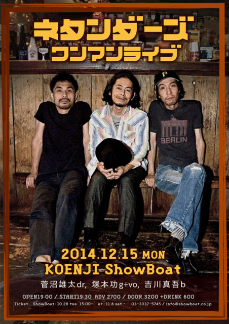 2014/12/15(月)、高円寺ショーボートにて、塚本功さんご出演 ライブが開催されます。 ネタンダーズ ワンマンライブ 出演: ネタンダーズ(塚本功g+vo、吉川真吾b、菅沼雄太dr) 開場19:00/開演19:30 前売¥2700/当日¥3200(ドリンク代¥600別) 整理番号がございます。 お早めにどうぞ。 前売りチケットは、高円寺ショーボート店頭にて発売中です。 代引郵送も承っております。(手数料¥580) 詳しくは、お電話、もしくはメールにてお問い合わせくださいませ。 高円寺ショーボート 03-3337-5745 info@show