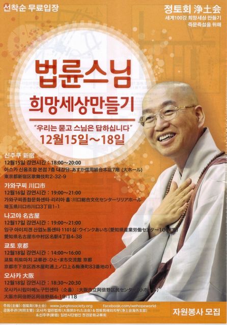안녕하세요 ! 오는 12월 일정으로 법륜 스님의 즉문즉설이 일본에서 열립니다. 모든 공연은 무료이며, 종교나 남녀노소와 관계없이 모든 사람이 입장 가능