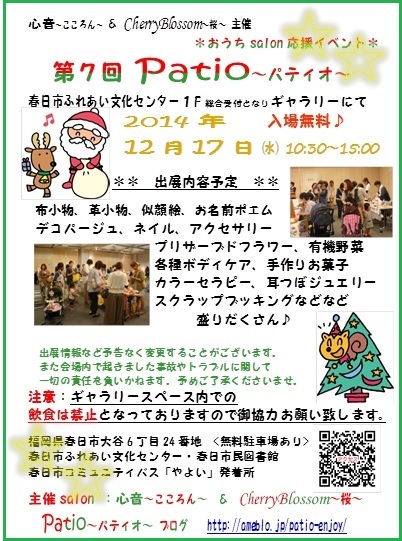 Ê¡²¬¡¢ÂÀºËÉܻԼþÊդǥϥó¥É¥á¥¤¥ÉÉʤȰì½ï¤Ë ¥«¥é¡¼¥»¥é¥Ô¡¼¤Î³èư¤ò¤µ¤»¤ÆÄº¤¤¤Æ¤Þ¤¹ ¥«¥é¡¼¥»¥é¥Ô¡¼¡õ¼ª¤Ä¤Ü¡õ¤ä¤µ¤·¤¤¿ôÈë st ¥¢¥í¥Þ¡õ¥Ï¥ó¥É¥á¥¤¥É ¡Ö cherry blossom ¡Áºù¡Á ...heartful healing... ¡× ¥«¥é¡¼¥»¥é¥Ô¥¹¥È¡õ¹Ö»Õ¤ÎóMOEó ¤È¿½¤·¤Þ ¡ÖÂ裷²ó¡¡£Ð£á£ô£é£ï¡ÁŽÊŽßŽÃލ޵¡Á¡×¤Î¤ªÃΤ餻(^^¢ö Á°²ó¤Ë°ú¤Â³¤¡¢¤ªÌ䤤¹ç¤ï¤»¤â¿¤¯ ³Ú¤·¤ß¤Ë¤·¤Æ¤¯¤À¤µ¤Ã¤Æ¤ëPatio¡Á¥Ñ¥Æ¥£¥ª¡Á ¡ù ¼¡²óPatio¡Á¥Ñ¥Æ¥£¥ª¡Á ¤Î³«ºÅ¤¬·èÄê¤Ç¤¹¡ù º£²ó¤â³Ú¤·¤¤Ê·°Ïµ¤¤Ë¤Ê¤ë¤è¤¦¤Ë¿´³Ý¤±¤¿¤¤¤È»×¤¤¤Þ¤¹(*^_^*) ¾Ü¤·¤¯¤Ï¥Ñ¥Æ¥£¥ª¤Î¥Ö¥í¥°¤ò