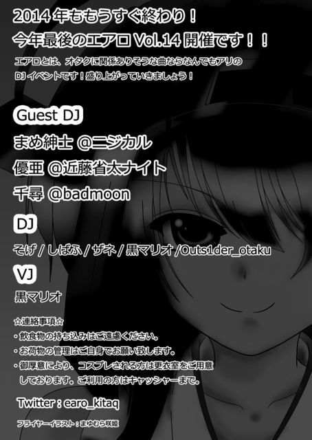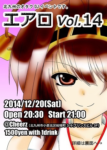 エアロvol14 【CHEERZ】 0935318870 北九州市小倉北区船場町3-9プリンスビル3F 開催日12月20日(土曜日) open 20:30 start21:00 料金1500(1drink付) レギュラーDJ そげ/しばふ/ザネ/黒マリオ/Outs1der_otaku ゲストDJ 優亜-近藤省太ナイト@EDEN 千尋-badmoon まめ紳士-ニジカル *エアロとは、アニメ、ニコ動、特撮、ボカロ、東 方とヲタに関係ある曲なんでもありのヲタダンパ です(`・ω・´)シャキーン コスプレ大歓迎! みんな遊びにきてね♪( *・ω・)ノ