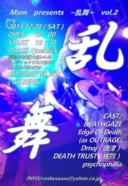 福岡のアウトレイジが大好きなファンの皆さぁ〜ん OUTRAGE TRIBUTE BAND "Edge Of Death"がライブをやりま〜す 【ライブ告知】 『Mam presents 乱舞vol.2』 12/20(sat) OP 18:00/ST 18:30 ADV 2,000yen LIVEHOUSE Queblick 〒810-0041 福岡市中央区大名2-6-39 ランディックビル大名B1F TEL:092-725-8785 http://www.queblick.com/ 【CAST】 ・psychophilia ・Dmaj(唐津) ・DEATH TRUST(佐賀) ・Edge Of Death ←コレ♪ 21:05〜 ・DEATHGAZE 年末の多忙な時期かと存じますが、是非遊びに来てくださぁ〜い