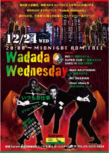 今回はクリクリスペシャル!クリクリッといきます〜! 12月24日(水) 新宿Garam 「Wadada Wednesday」 仕事人に感謝〜〜〜!の気持ちをこめて 毎月第4水曜日、城南KAYAセレクター2人を中心にお届けする MIDNIGHTまでのイベント 「Wadada Wednesday」。 週のなか日、仕事帰りに極上のお酒と音楽でエナジー再チャージ !スーツで来場または自称OLの方にはオツカレおつまみサービス! ・GUEST SOUND MAD AKUTAMAN fr 城南KAYA ・SOUND INO fr 城南KAYA / SUPER CUB fr 城南KAYA/ SAKU fr 熱胸CREW/ NAKA fr 広島/ and more!!!