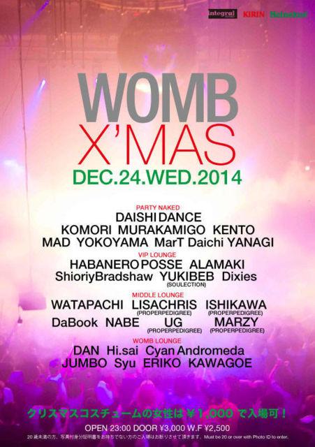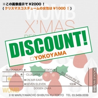 ◆X’MAS in WOMB◆ 渋谷最大級クリスマスパーティー! 4フロアで音に飢えたサンタとトナカイが大暴れ! 【女性限定!クリスマス・コスチューム割引料金 \1000】 当日は大変混雑が予想されます。 ディスカウントご希望の方は早めにご連絡下さい。 もしくは3つの写真の中のDISCOUNTと書かれた画像を エントランスでご提示頂けるとディスカウントとなります。 ご自由にお使い下さい^^ 12/24(Wed.) open//23:00〜 DOOR:¥3000, W/F & MEMBER:¥2500 -PARTY NAKED- GUEST: DAISHI DANCE LINE UP: KOMORI, MURAKAMIGO, KENT