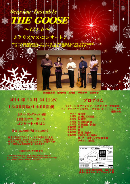 結成17年目、プロのオカリナアンサンブルの草分け的存在です。 詳しい情報は下記URLからごらん下さい。 http://www16.ocn.ne.jp/~zpg/chirashi/ ザ・グースについての詳しい情報は下記URLから! http://www16.ocn.ne.jp/~zpg/goose/ 過去の演奏会からの音源もございます。 チケットのご予約方法も掲載しております。