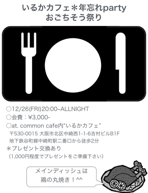 管理人さま 貴重なスペース失礼します。 中崎町で"いるかカフェ”という、週末カフェを運営しているものです。 年内最後の開店日に、忘年会+一日遅れのクリスマスを祝うパーティー開きます!料理がプロ並に上手な友人に協力頂き、美味しい料理をお腹いっぱい食べてもらえるよう準備をしております。メインディッシュはチキンの丸焼きです。 〜menu(予定)〜 *二種類のパテをフランスパンで *鳥の丸焼き *チキンピラフ *具沢山コーンスープ *鳥ハムサラダ二種類 *ハマチのカルパッチョ 美味しそうでしょ!(^^) 当日はプレゼ