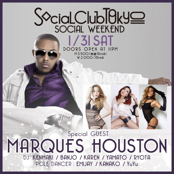 1/31(土)Marques Houston来日決定!! ディスカウトご希望の方は代表者名、人数を添えて メッセージお待ちしております。 ※当日混雑が予想されるため早めのご入場お待ちしております。 DOORS OPEN AT 11pm ENTRANCE FEE Men: 3500yen + 別途1Drink Ladies: 2000yen / 1Drink INTRODUCTION B2F - MAIN FLOOR SPECIAL GUEST MARQUES HOUSTON DJ KENMAKI BANJO KAREN YAMATO RYOTA POLE DANCER EMIJAY KANAKO YuYu ESCAPE LOUNGE SWITCH DJ KAZ HIDEMI SHINOBU CO-HEY GAIAN MASAFUMI TAKUYA CO