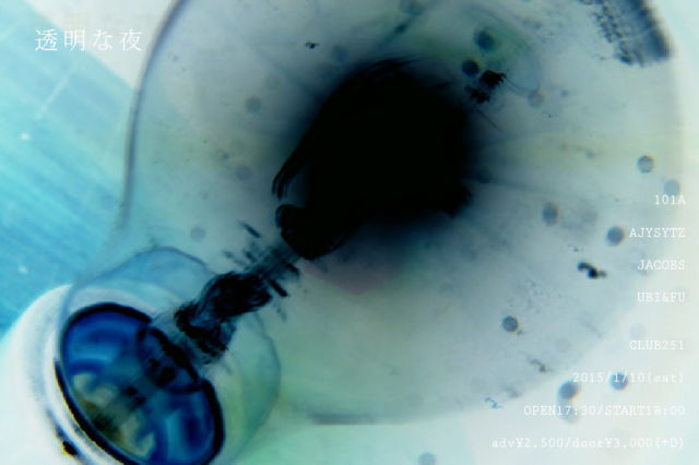 2015/1/10 (Sat) --- 下北沢CLUB251 「透明な夜」 OPEN 17:30 / START 18:00 ADV. ¥2,500 / DOOR ¥3,000 (+1Drink) ■Act AJYSYTZ JACOBS UBI&FU 101A ■food パラソルキッチン(by AJYSYTZ Ba.平泉佑真) ■チケット取り扱い ・バンド予約 >> http://101a.org/form/ticket.html ・251店頭(12/10〜) ・プレイガイド(12/10〜) LAWSON >> http://l-tike.com/ (Lコード 73176) e+ >> http://eplus.jp/sys/T1U14P0010163P0108P002142956P0050001P006001P0030001 下北沢CLUB251 http://www.club2