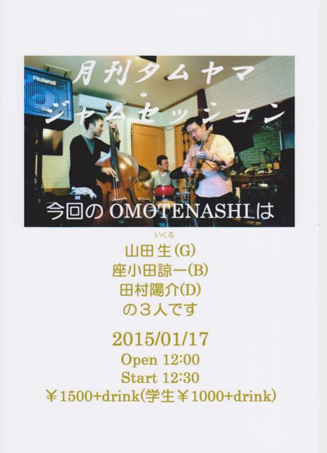 £±£·Æü¡ÊÅÚ¡ËÃë Jazz ·î´©¥¿¥à¥ä¥ÞJam Session »³ÅÄÀ¸(G) ºÂ¾®ÅÄÎʰì(B) ÅļÍÛ²ð(D) Open;12:00: Start;12:30 ¡ï1500+drink(³Ø:¡ï1000+drink)