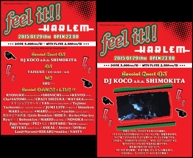 2015/01/29(thu) feel it!! at ½ÂëHARLEM ¡ú¡ú¡ú GOOD MUSIC & SPECIAL SHOW ¡ú¡ú¡ú ²»¤ò´¶¤¸¤¢¤¤¤Þ¤»¤ó¤«¢ö SPECIAL GUEST DJ¤Ë¤Ï DJ KOCO a.k.a. SHIMOKITA ¤¬HARLEM ½é ÅÐ ¾ì ¡ª¡ª ¤â¤Á¤í¤óVINYL ONLY¤Ç¤Î¥×¥ì¥¤¡ª¡ª ¸«Æ¨¤·¡¢Ä°¤Æ¨¤·¸·¶Ø¤Ç¤¹¡ª¤Þ¤µ¤Ë"feel it!!"¤ÊÌë¤Ë¤Ê¤ë¤Ç¤·¤ç¤¦¡ª¡ª À¤³¦¤ÎVINYL DIGGER¤ò¤âÓ¹¤é¤»¤ëÁª¶Ê¤È¡¢ ¥Ð¥È¥ëDJ¤Ë¤â°ú¤±¤ò¼è¤é¤Ê¤¤¥Ñ¡¼¥Õ¥©¡¼¥Þ¥ó¥¹À¡¦µ»Î̤òÊ»¤»»ý¤Á¡¢ ¥é¥¤¥Ö´¶120%¤Î¤½¤ÎPLAY¤Ï¾ï¤Ë¥ª¡¼¥Ç¥£¥¨¥ó¥¹¤ò̥λ¤¹¤ë¡£ ¤³¤ì¤Þ¤Ç¡¢"SHIMOKITA HOUSE"¡¢"WHO GOT FLAVA?"¤Ê¤É¿ô¡¹¤Î¥¯¥é¥·