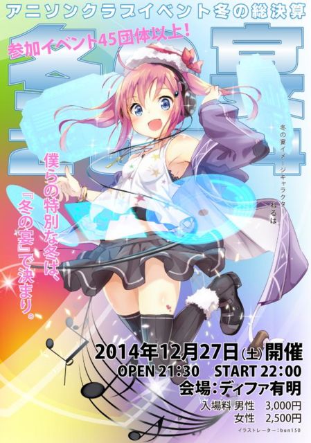 ディファ有明で開催! 12月27日 アニソンクラブ最大級イベント★ 「冬の宴」柚子こまち出演決定…! まさかの事態に本人もビビっていますが決定しました。 なんと前回参加人数「2000人」だそうです…うそ〜〜〜ヾ(;▽;)ノ 突然の大舞台への出演でド緊張ですが、 ぜひ応援に来てもらえると嬉しいです!!!!!がんばります!!!!! 「冬の宴」の前売りチケットの販売を開始しています。 柚子こまちから直接購入お願いします、 12/14 終日 12/21 終日 12/27 〜19:00くらいまで 新宿カラオケ館歌舞伎町本店にて購入可能で